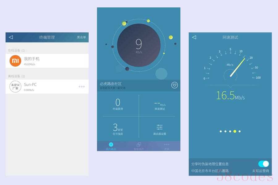 在“我的路由”界面,由‘必虎路由社区’分为上下两部分,上半部分显示的是实时网速,下半部分则为必虎的几个基本功能,‘终端管理’中可以看到所有连接到必虎的设备,可以对其限速、拉黑等操作;‘网速测试’则可以对所用的实时带宽进行测试,做到心里有数。