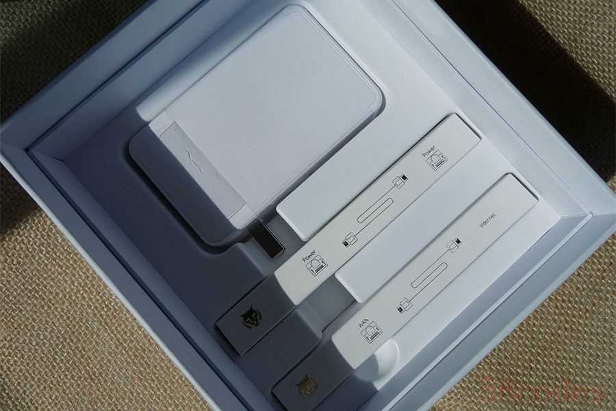 包装内部采用分层式的设计方案,取出路由器及快速设置指南后,可以看到放在不同凹槽里的适配器及独立包装的电源线和网线,码放整齐且易拿取。