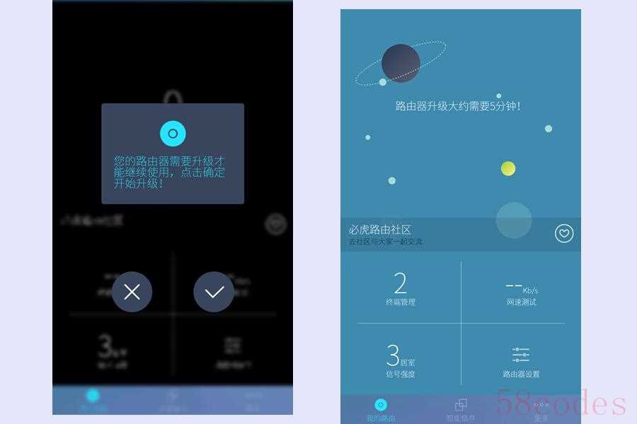 设置完成基本信息后,便会进入到APP的主界面,过程中会有路由器升级的提示,按提示操作即可。等待升级的过程中可以看到APP控制界面还是比较简洁的,整体以蓝色为主色调。分为三个板块,用户在操作管理上也能快速的掌握。