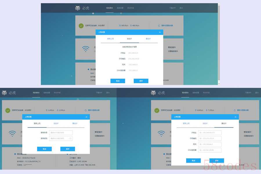 点击‘上网设置’,可能与笔者从原有智能路由器的端口接线有关,直接跳到动态IP界面,除此之外还有宽带上网、静态IP供接入选择。