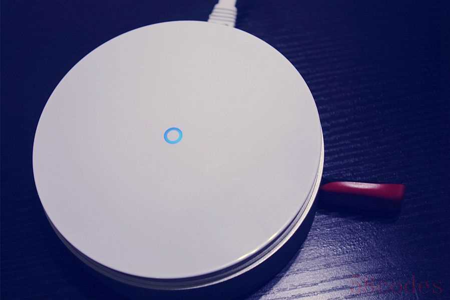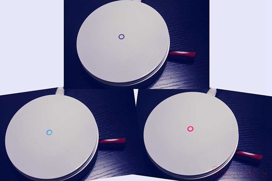 正中心的圆形镭雕呼吸灯采用的是红蓝双色,连接完备通电后,显示红色时表示正在启动,显示蓝色时表示运行正常,当红蓝灯交替闪烁时则表示无法上网。呼吸之间,代表它在。