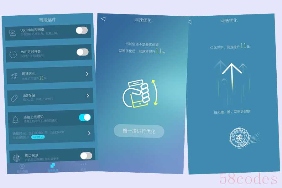 “智能插件”中,WiFi定时开关、终端上线通知、周边探测等功能按提示操作即可。比较有意思的是‘网速优化’,一个很好玩的功能,竟然让我撸一撸,还要每天撸一撸,还好是网速。不过这几天撸下来(咳咳,别多想),11%这个数据出现的最多,话说是要来个双11吗?