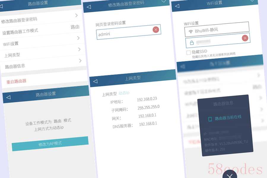 点击‘路由器设置’,可以对登录密码及WiFi进行设置,可以查看上网类型和路由器信息,可以设置路由器的工作模式等。