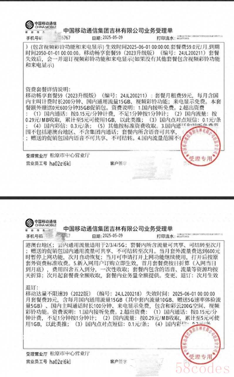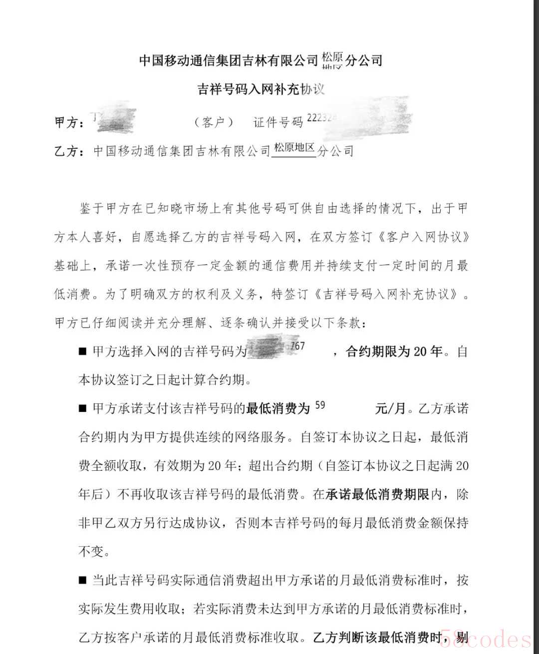 丁先生说,办完过户自己越想越不对劲,又联系移动询问,凭啥强制抬价设定59元的最低消费?20年不能携号转网、不能降资费有啥法律依据?“移动态度强硬,说你签了合约,就得按合约执行。让拿依据,他们拿不出来。我又投诉到工信部和12315,但最后都是转到移动来跟我对接。”丁先生说,从5月15日第一次开始投诉,至今已半年多,“这两天移动还在联系我,依旧说不清法律依据,说是移动公司内部规定。”丁先生认为,移动公司的做法违反了消费者权益保护法中的消费者自由选择权及消费公平,“啥公司的内部规定还能大过法律?这就是霸王条款强制消费,用不平等条约绑人20年。”协议显示——每月39元套餐变更为59元最低消费,20年后不再收取最低消费中国移动通信集团吉林有限公司业务受理单显示,受理营业厅为松原市中心营业厅,5月9日,丁先生办理了新套餐“移动畅享套餐59(2023升级版)”,退订了套餐“移动达量不限速39(2022版)”。系统备注为办理了产品变更。