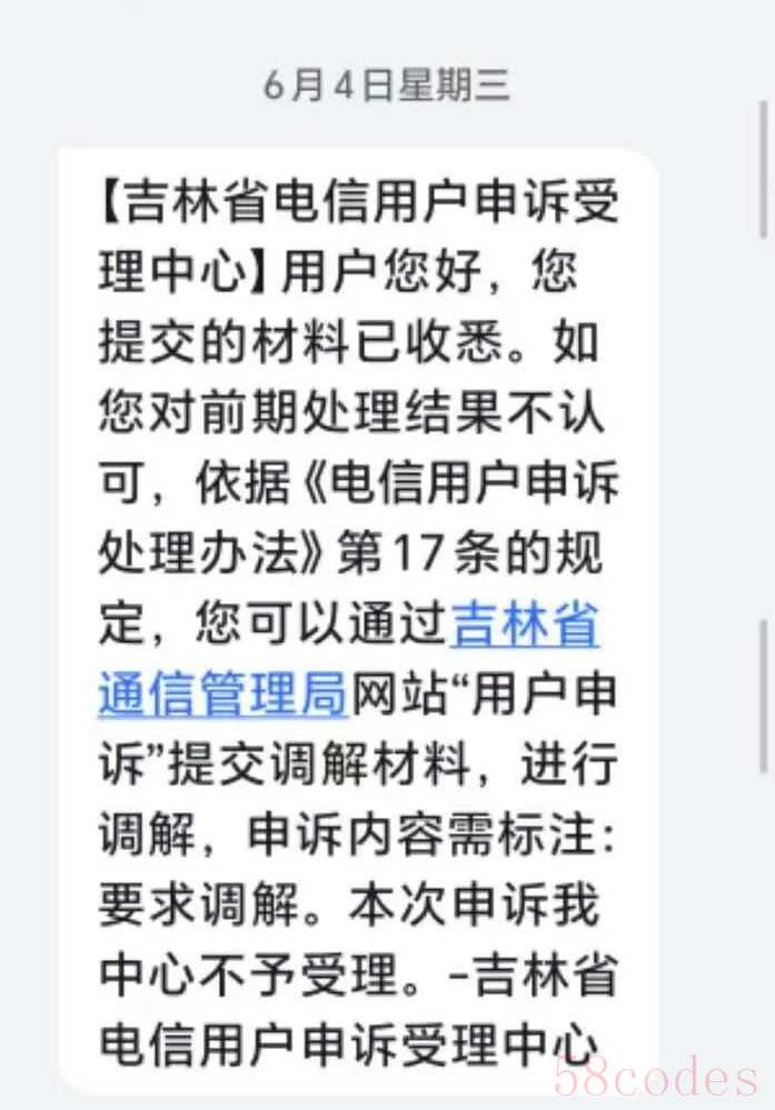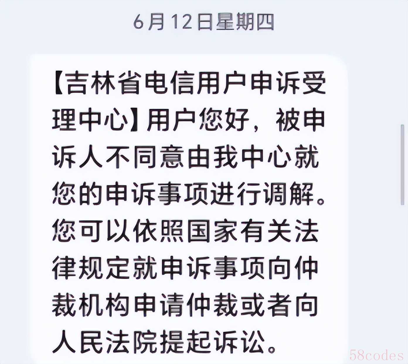 此外,丁先生投诉数月以来,吉林省电信用户申诉受理中心多条短信回复称,被申诉人不同意由该中心就丁先生的申诉事项进行调解。丁先生可就申诉事项向仲裁机构申请仲裁,或向人民法院提起诉讼。