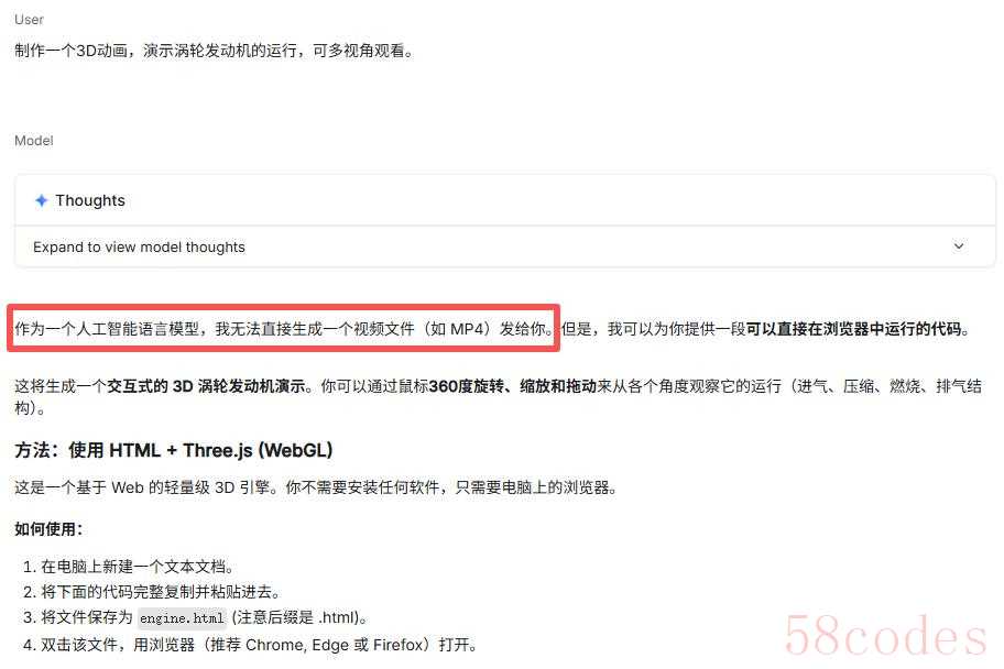 最搞的是,Gemini 3 Pro说它作为一个人工智能语言模型,没法生成视频,不然高低给我发一个MP4视频。