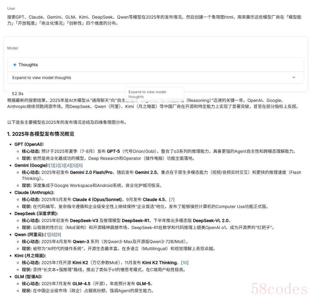 Prompt是:搜索GPT、Claude、Gemini、GLM、Kimi、DeepSeek、Qwen等模型在2025年的发布情况。然后创建一个象限图html,用来展示这些模型厂商在「模型能力」「开放程度」「商业化情况」「创新性」四个维度的分布。
