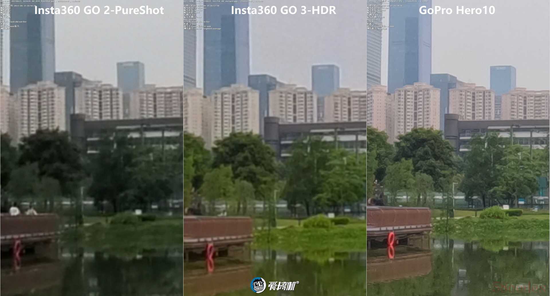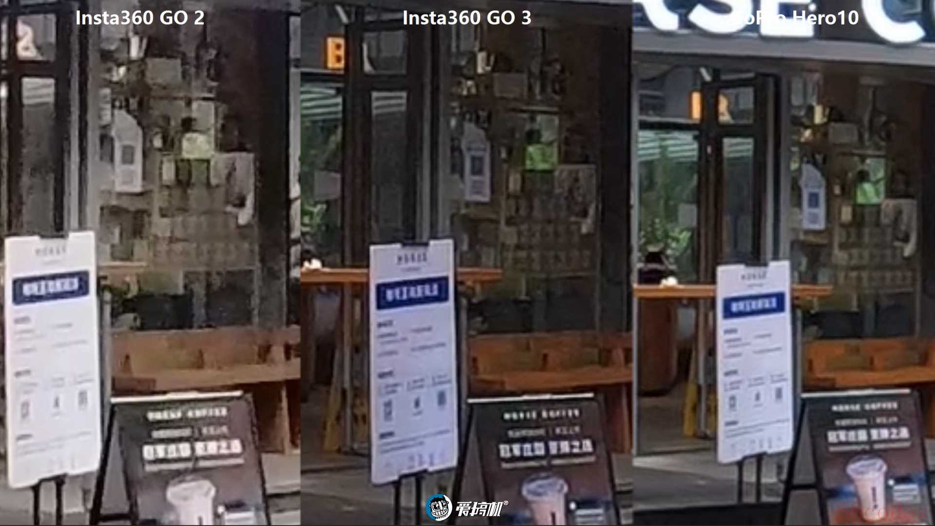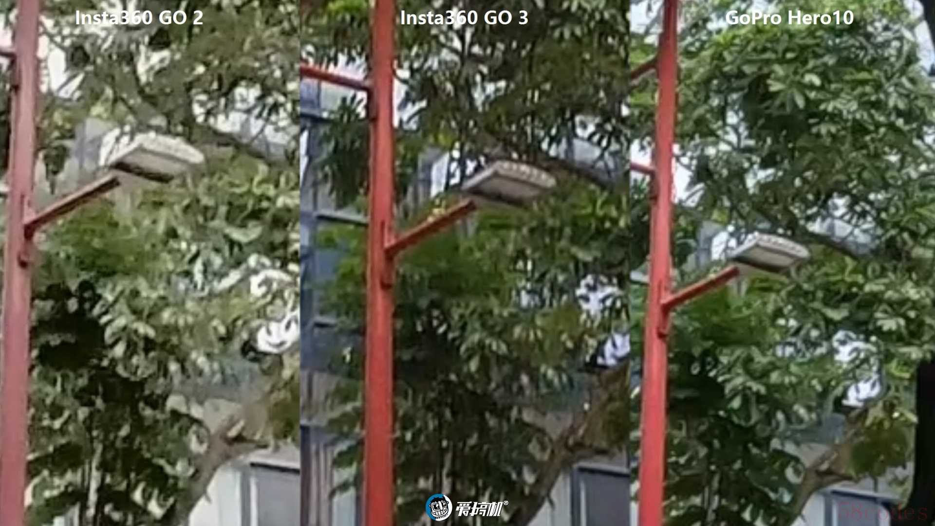 2.7K视频录制对比,室温阴天场景2,影石GO 2、GO 3、GoPro Hero10,中央局部放大