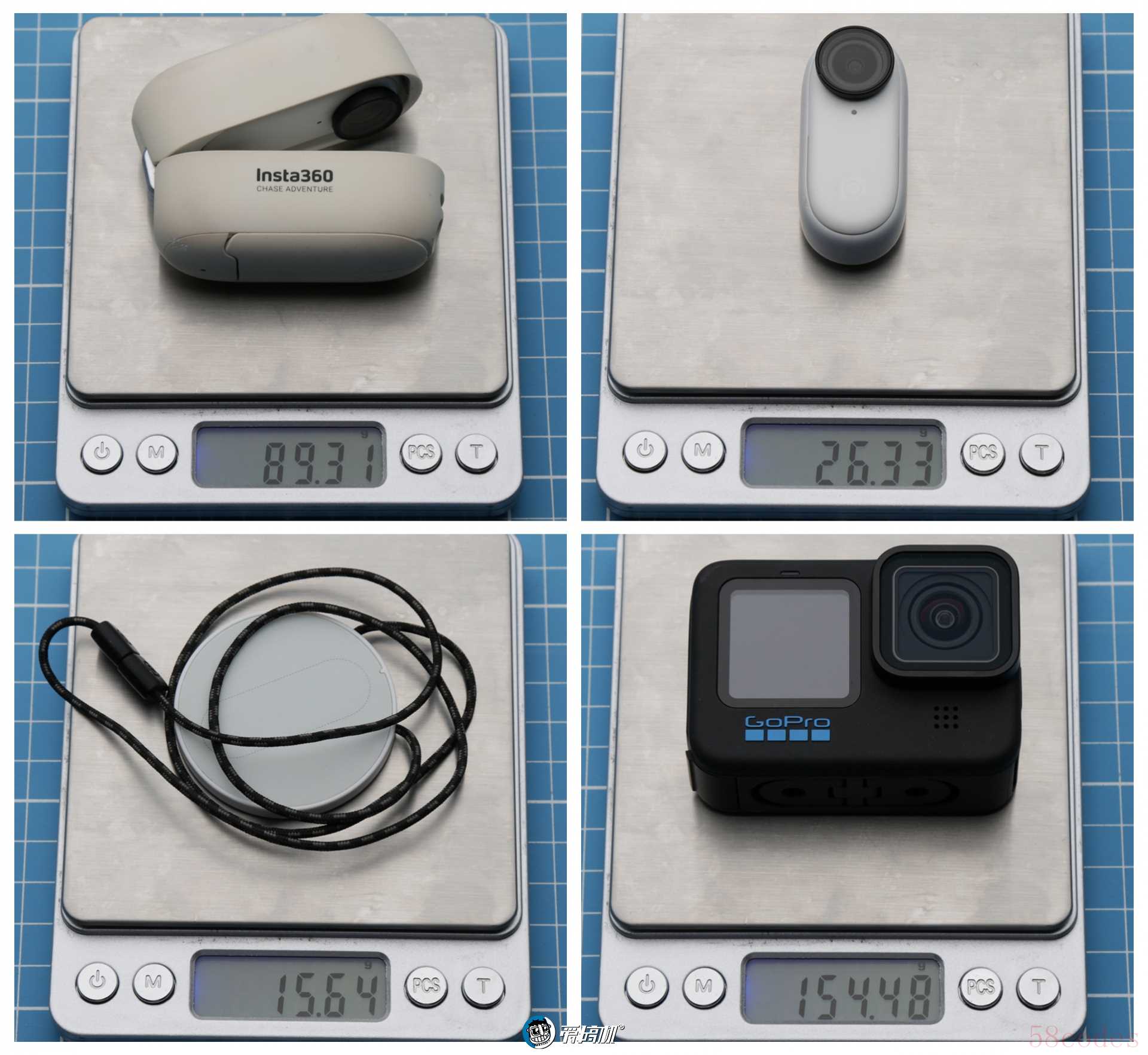 GO 2与充电盒、GO 2本体、磁吸挂绳、GoPro Hero10重量 ↑GO 3无论是配件还是本体都增重了,但即便是加上带翻转屏的拓展舱,依然比GoPro Hero10轻了超过20g。