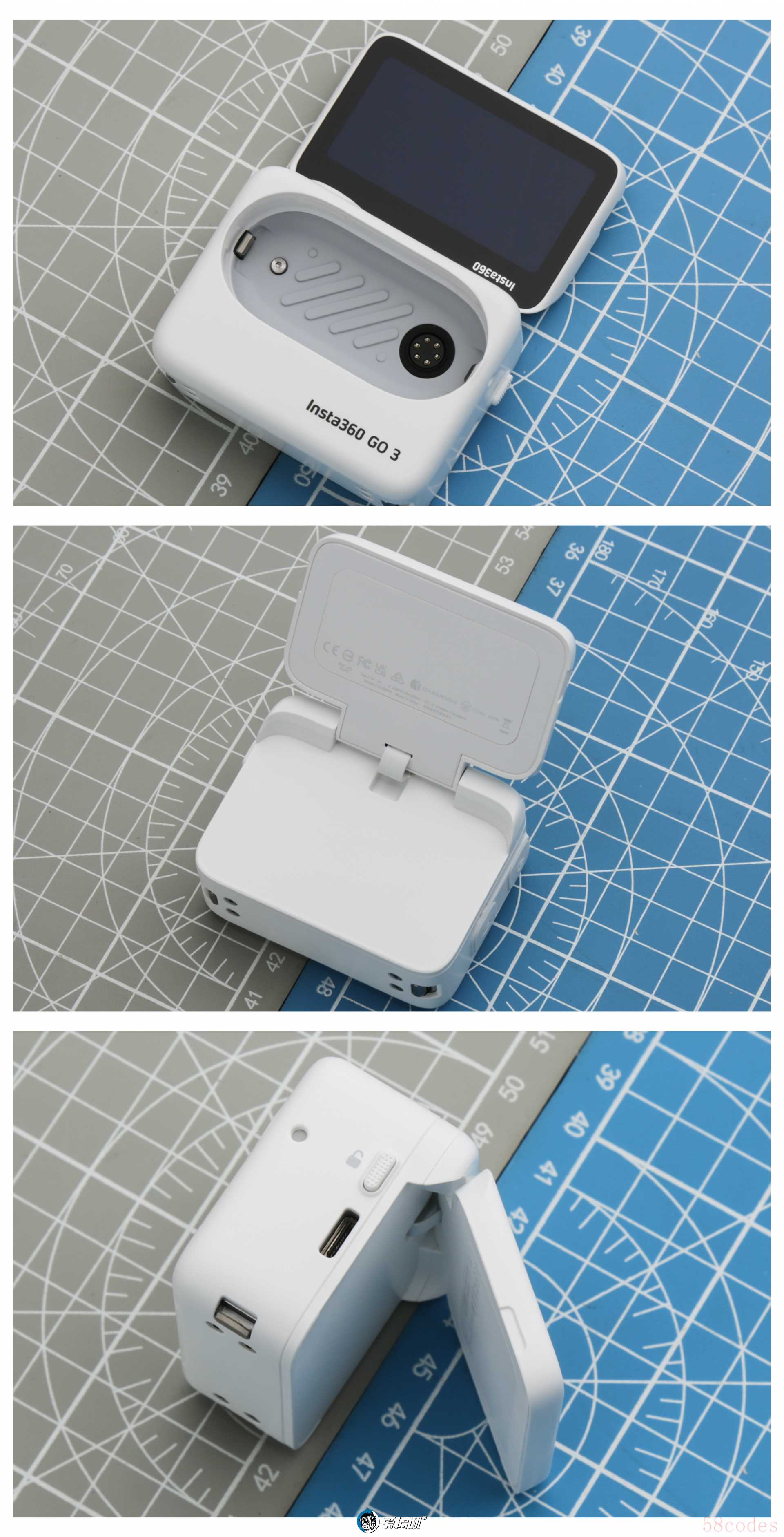 连着拓仓舱看,白色的“运动相机”有致命的颜值,甚至还有翻转屏,这谁顶得住啊。它甚至还有定制贴纸 ↑,这拇指相机的外观,算是被影石玩明白了。众所周知,影石GO系列的充电盒/拓展舱是cosplay爱好者,GO 2是装TWS耳机,而GO 3装的是运动相机,也可以把GO 3当做是“在运动相机的西瓜瓢里挖出来的拇指相机”。GO 3“长大了”,这就是相机本体外观上的最大变化。背面多了散热结构和卡扣,户外运动和上穿越机时,用来防止相机和飞机在空中分头行动。本体和配件全都大了一个号,也更强了,连代价全都是统一的变大变重。以前TWS耳机厚度的充电盒,现在变运动相机那么厚,牛仔裤表示我们这段关系,现在有点突兀。