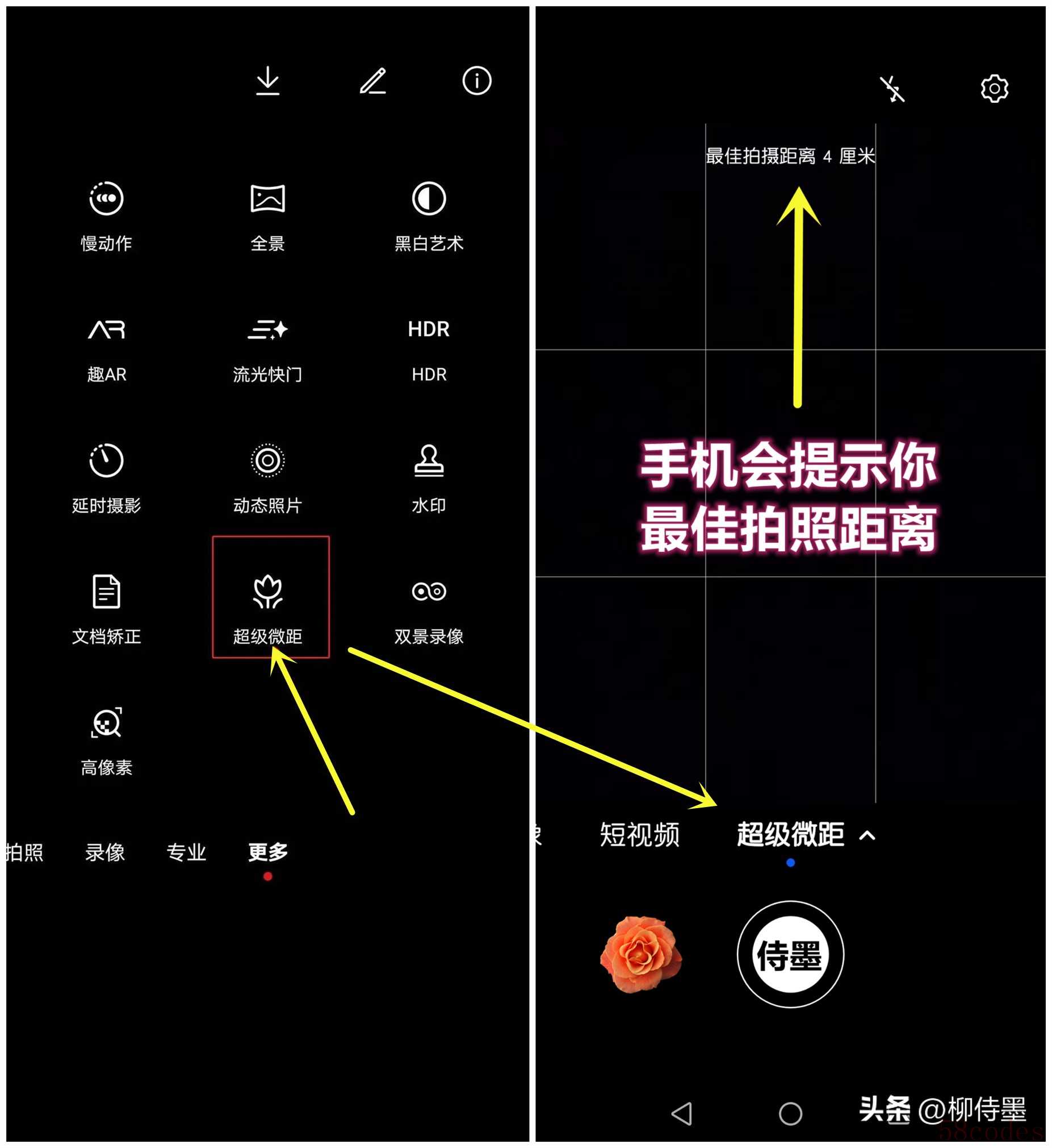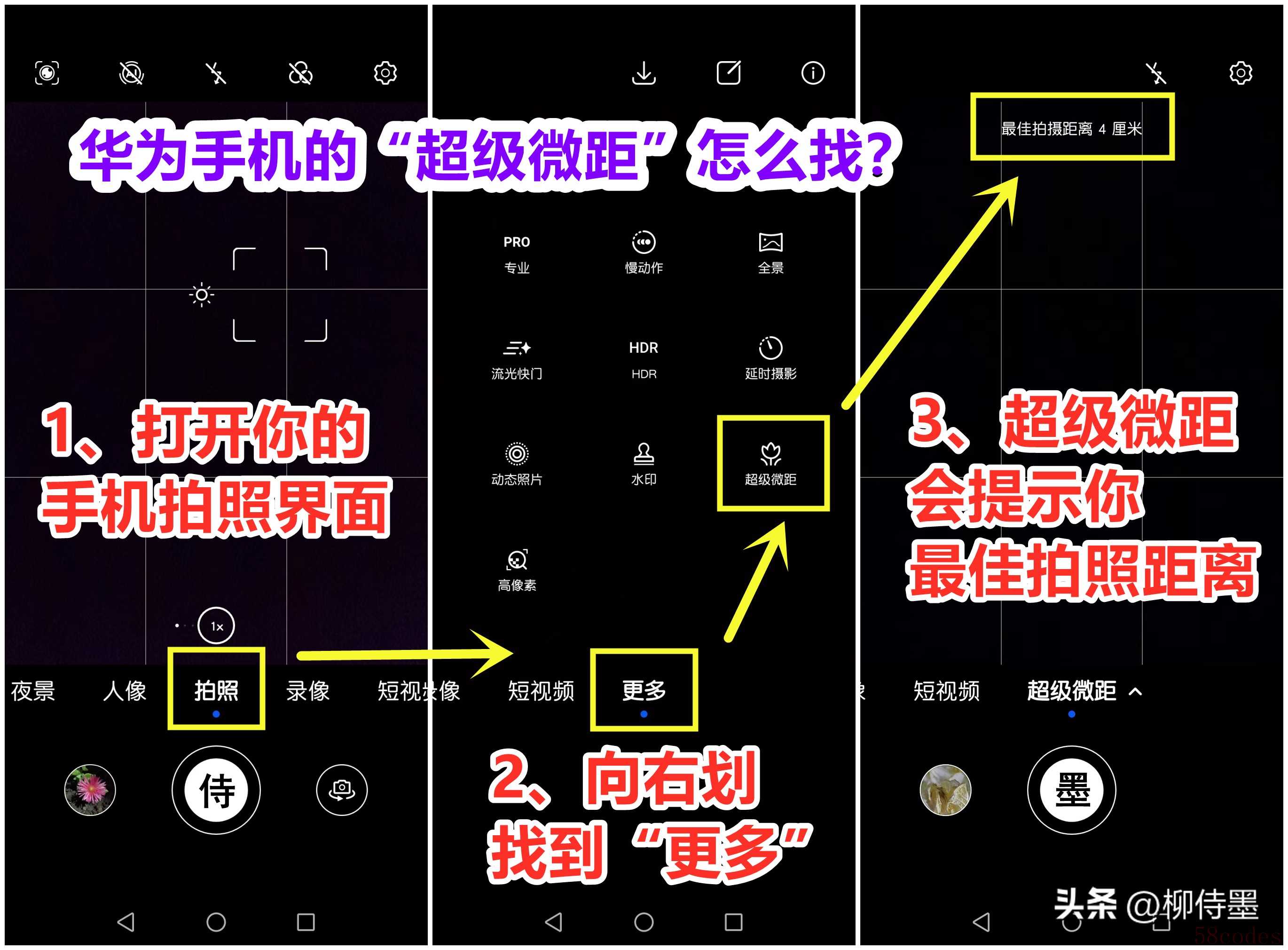 图3来来来,继续看图。咱们往左或者往右扒拉一下,手机的拍照界面,你会发现,有一个“更多”。以华为手机为例,手机的微距功能,也就是“超级微距”,就藏在这个“更多”里。你看,“宝藏”功能都是“藏起来”的。就等着你找呢!所以呀,没事儿的时候,利用碎片化时间,多扒拉扒拉你的手机,相信侍墨,你会发现各种惊喜的。