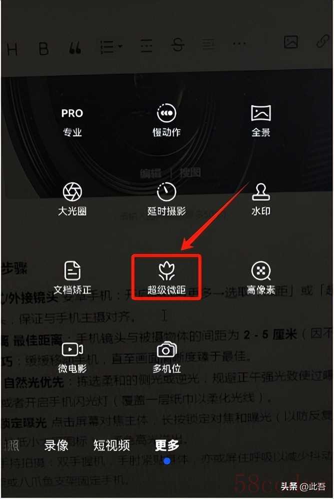 - 开启微距模式/外接镜头 安卓手机:开启相机→更多→选取「微距」或「超级微距」。 外接镜头:夹紧镜头,保证与手机主摄对齐。
