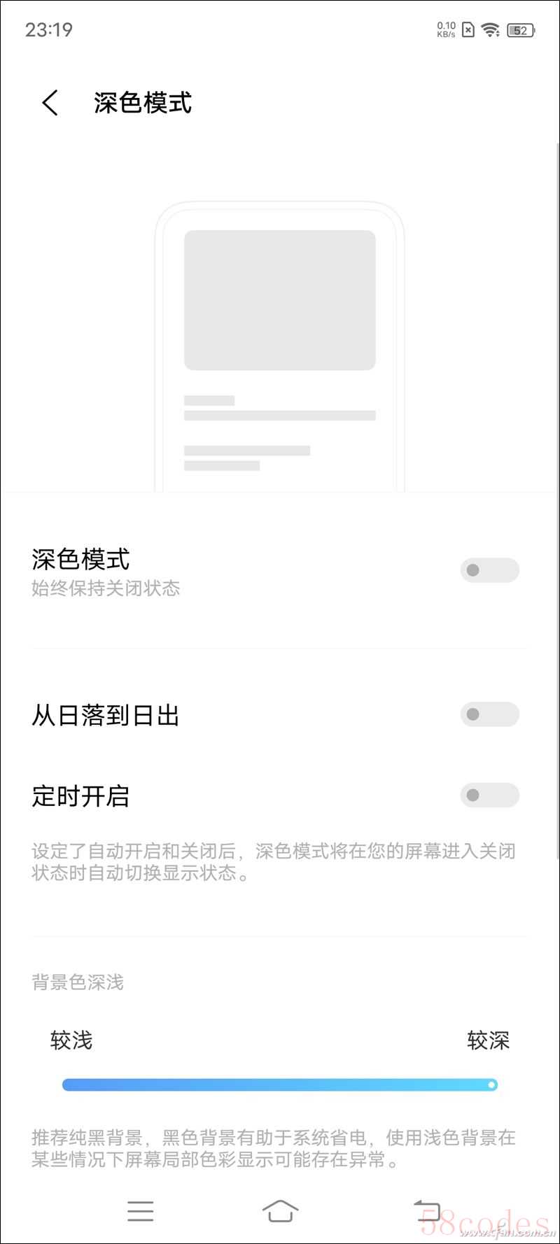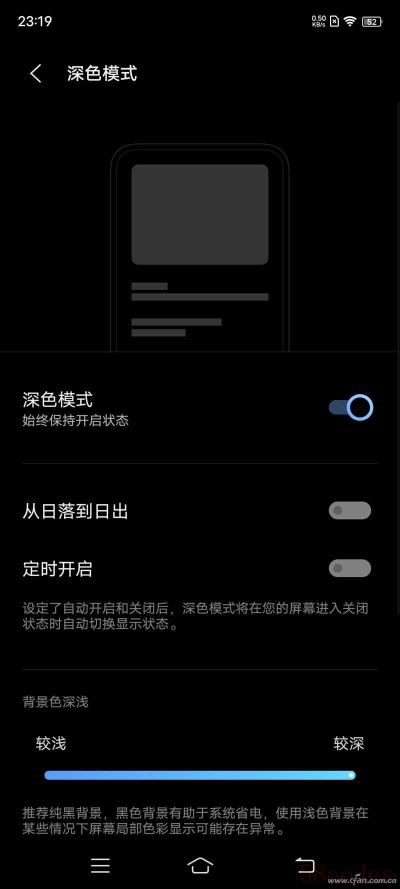 如果手机采用了OLED材质的屏幕,可以考虑激活深色模式。在该模式下全局背景色都会变为全黑,可以发挥OLED屏幕显示黑色几乎不耗电的优势提升续航时间。如果手机屏幕不是OLED,该模式对续航的影响就微乎其微了。