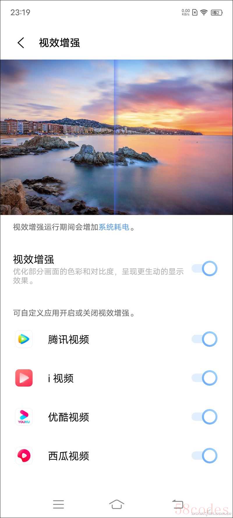 一线品牌都会在系统中加入特色显示增强功能。比如vivo的高端机型就加入了“视觉增强”,在运行腾讯视频、i视频等指定APP时会优化部分画面的色彩和对比度,从而呈现更生动的显示效果。