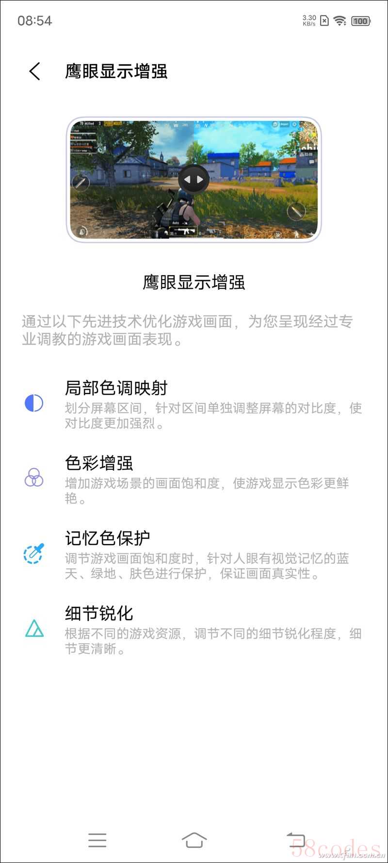没错,这类功能仅适配部分APP,并非所有APP都能因其获益。此外,在vivo手机的游戏魔盒中还能找到“鹰眼显示增强”,开启后也能显著提升游戏画面的亮度和对比度,看起来更绚丽。
