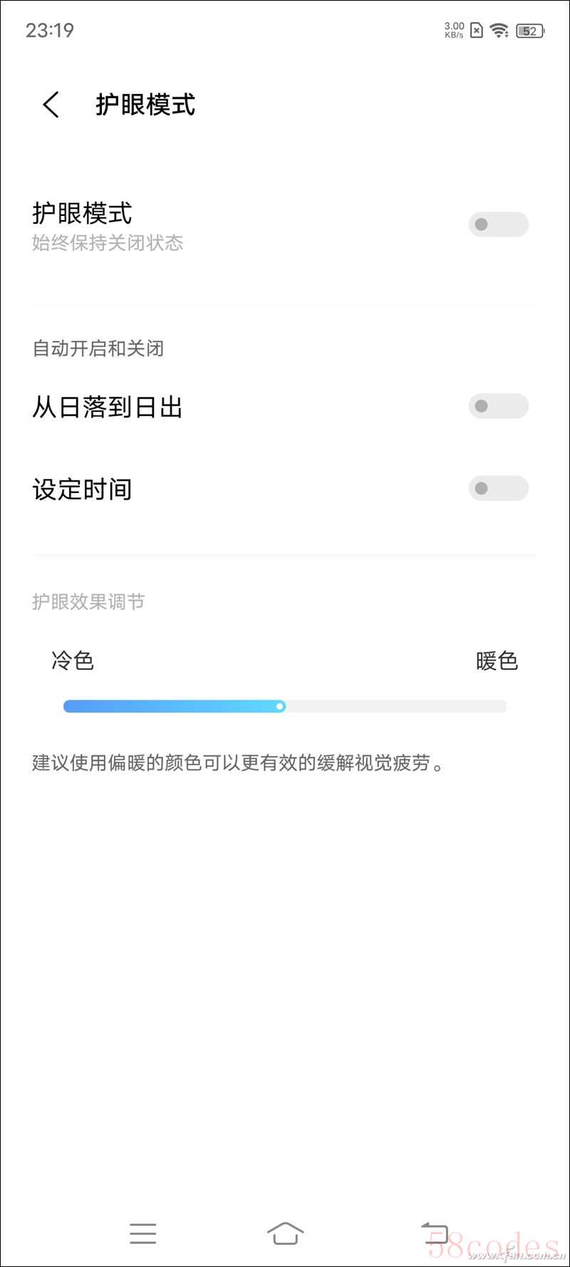 如果你每天盯着手机的时间很长,建议找到并开启“护眼模式”。打开该功能后屏幕会过滤蓝光,对视力的保护更好,但会导致屏幕色彩偏黄,而我们可以根据观感在冷色和暖色之间微调,理论上暖色更好但偏黄问题会更明显。