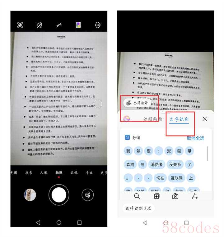 然后就会自动进行识别,并进行全屏翻译或者保存电子档。