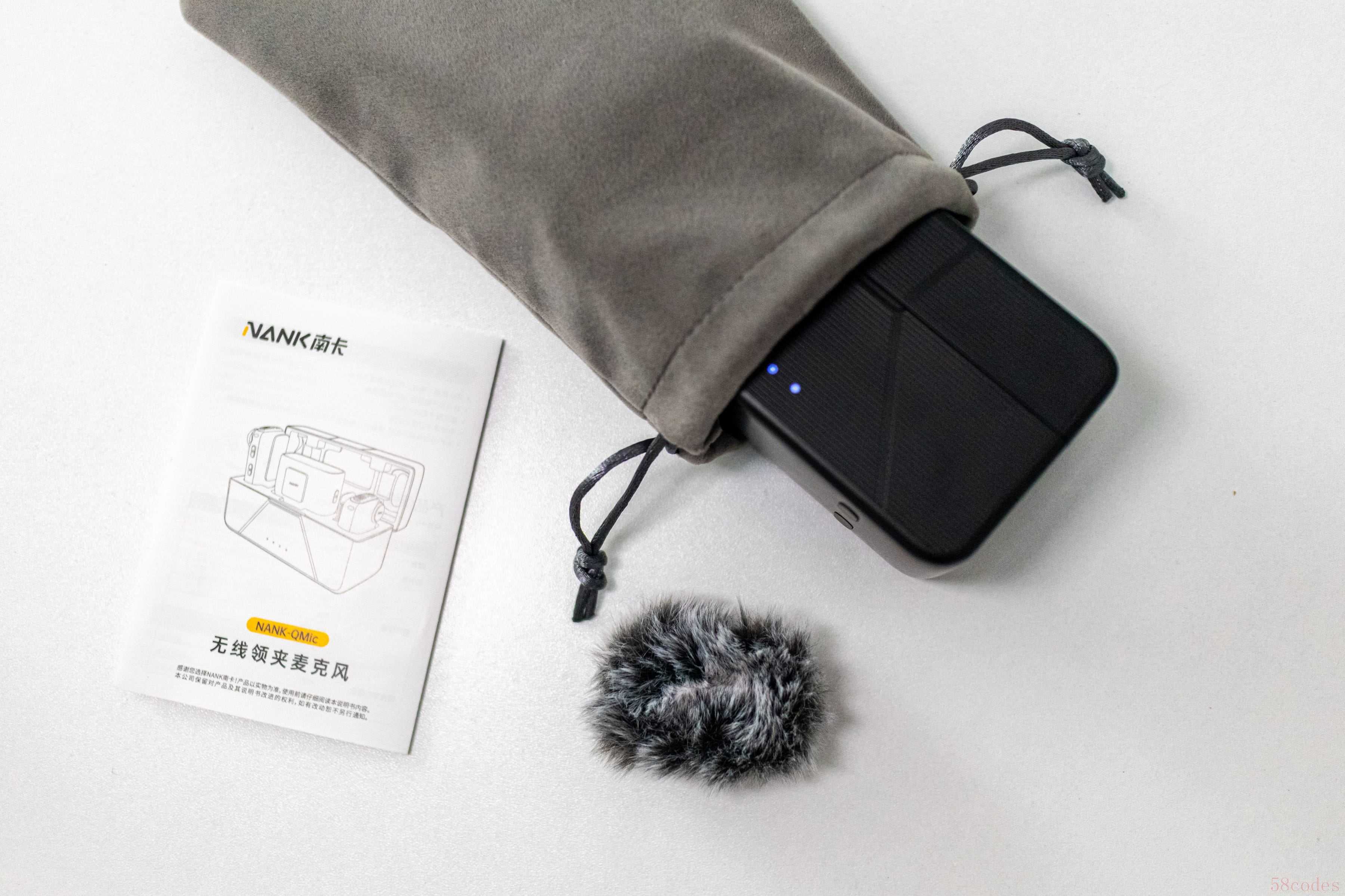 打开包装盒,内部配件摆放得整整齐齐,仪式感拉满。清单包括:一个黑色充电盒、说明书、合格证、两副Type-C监听耳机、一根3.5mm双头音频线、Lightning/Type-C双转接头、一对毛茸茸的防风毛套,甚至还有一个贴心的收纳袋——柔软耐磨,能把所有配件妥善收纳,这一点很多同类产品都做不到。