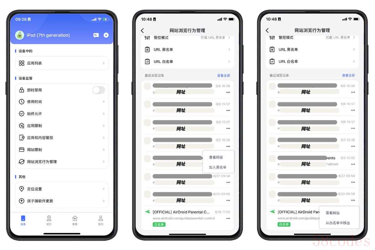 【网站浏览行为管理】里可以手动添加网站黑名单、白名单,也可以在最近浏览记录里,点击查看网址的内容。长按单条浏览记录,可以将对应的网址移入黑名单或白名单。