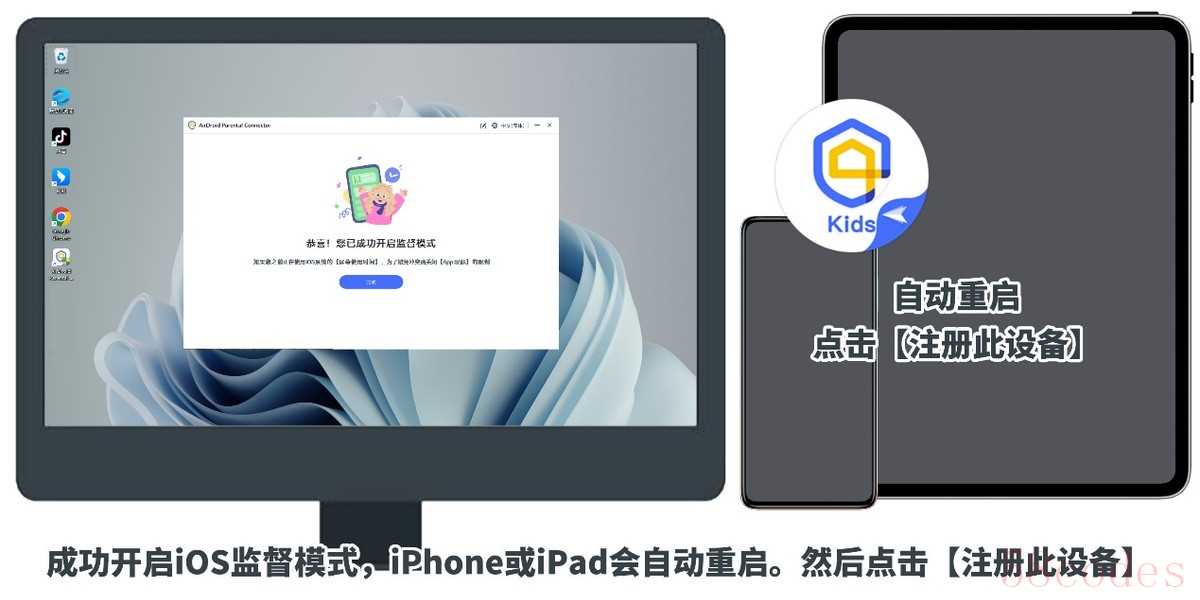 在被控的iPhone(或iPad)内点击【信任】该设备。等待片刻,电脑界面会出现【恭喜!您已成功开启监督模式】。被控的iPhone(或iPad)会自动关机重启。iPhone(或iPad)重启后,屏幕界面会跳转至远程管理注册提醒,点击【注册此iPhone(或iPad)】,等待配置成功就可以拔掉数据线,此后也不需要用到孩子的iPhone了。