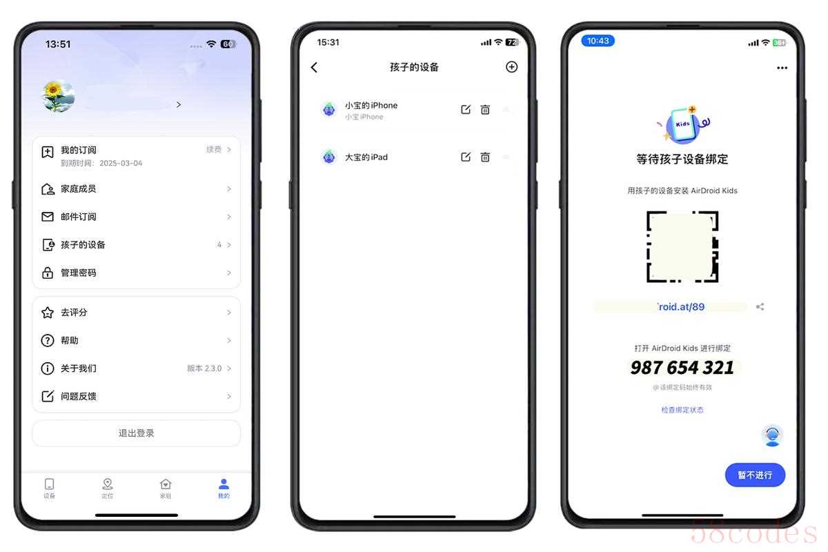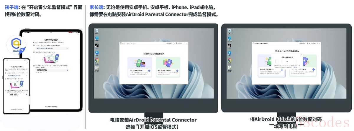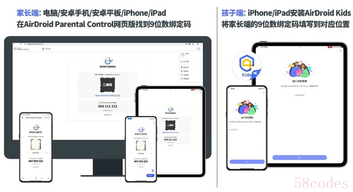 步骤二的具体操作:AirDroid Parental Control网页版注册完成后,选择【家长】身份,然后就会跳转至绑定界面,里面有一个9位数的绑定码。将9位数绑定码填写到AirDroid Kids的界面内,点击【加入】,确认账号无误就可以点击【确认】。然后填写基础信息,并且授予定位权限。权限开启完毕,管控端和被控端的界面都跳转至【开启青少年监督模式】。