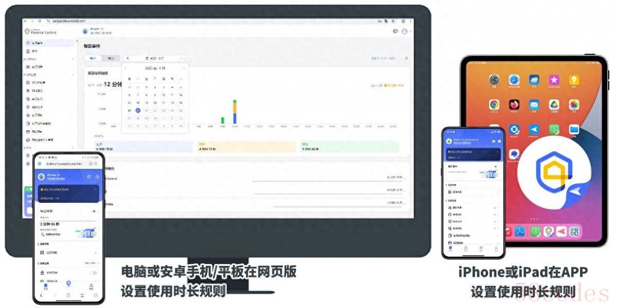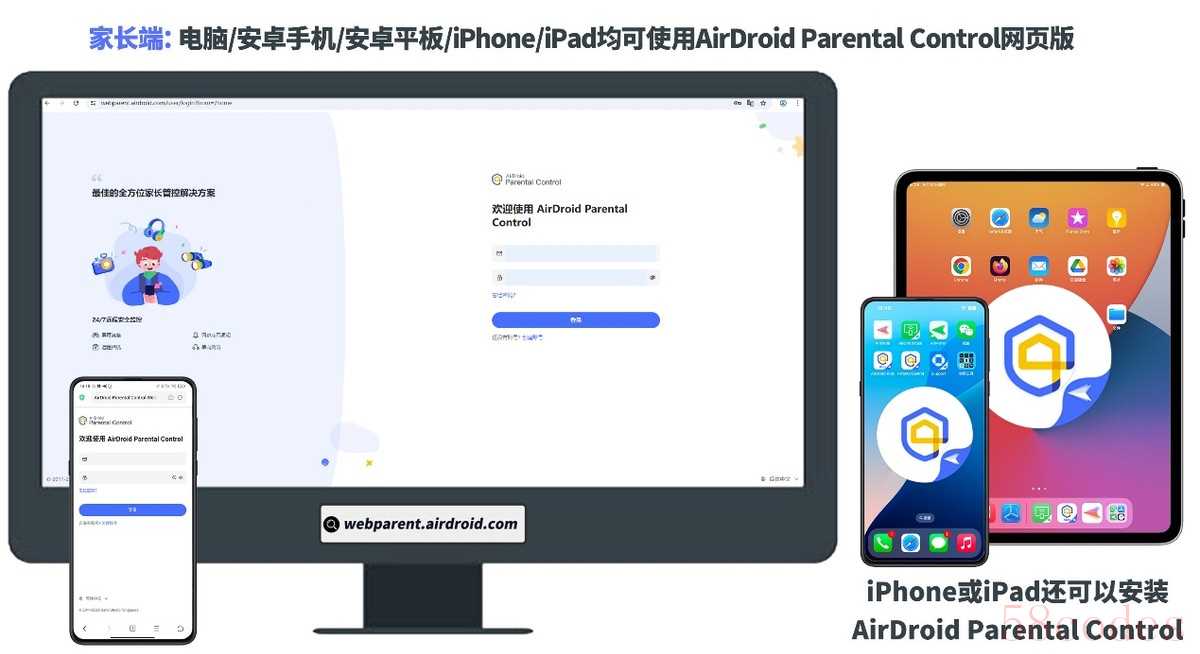 AirDroid Parental Control有网页版,这个网页版可以用于任意浏览器,也就是说,家庭成员只要在各自的手机(电脑)浏览器里打开AirDroid Parental Control网页版,不管他们偏好使用手机还是电脑、OPPO还是iPhone,都可以参与到管理孩子使用iPhone或iPad的家庭活动中。