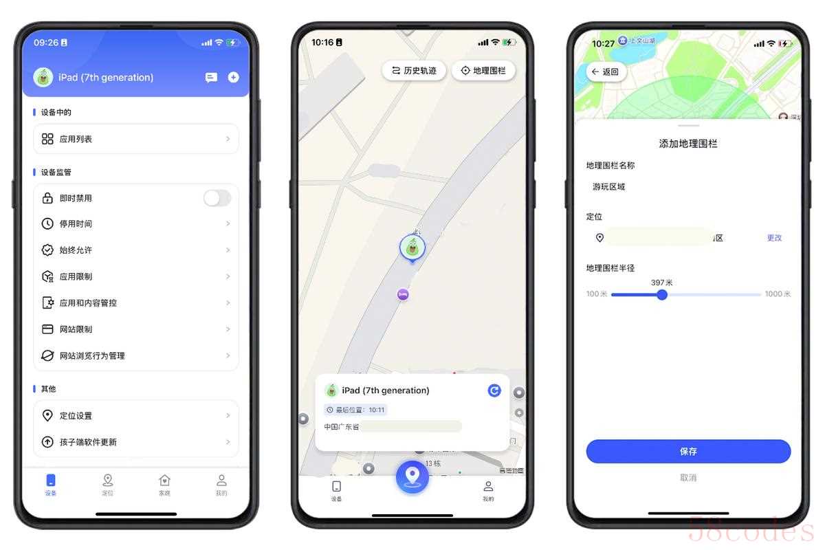 点击AirDroid Parental Control底部栏的【定位】,可以查看被控设备的实时定位,也可以设定地理围栏,当被控设备进入或走出该地理围栏,管控端都可以收到提醒。