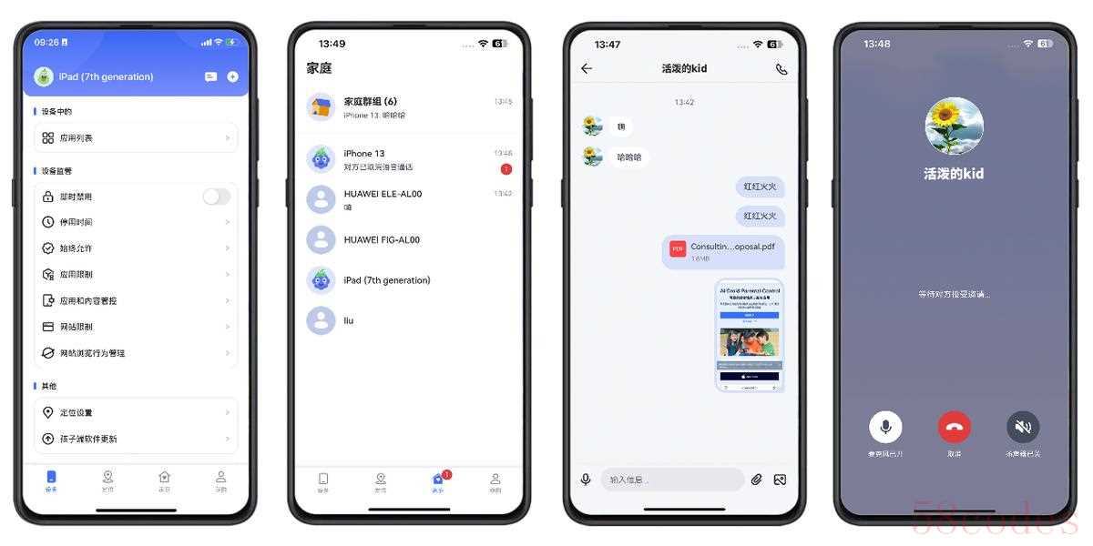 底部栏的【家庭】汇总了绑定在一起的全部设备,里面有群组和单聊,可以发送语音消息、文字消息、发送文件、视频和图片。点击右上角的听筒按钮,还可以在线通话。