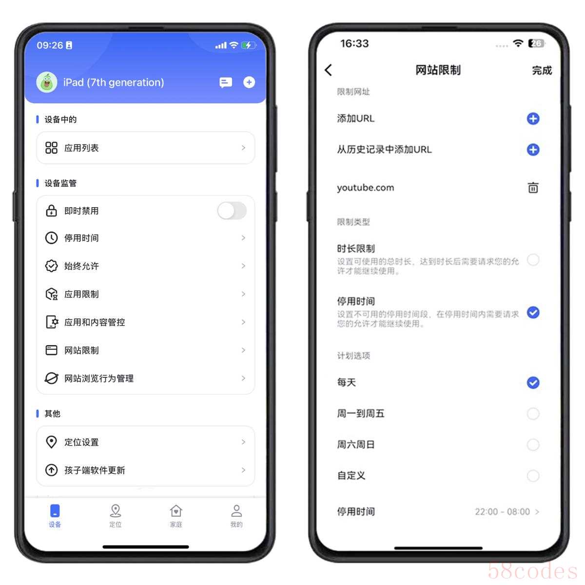 【网站限制】可以手动添加网址,设定时长限制与停用时间。