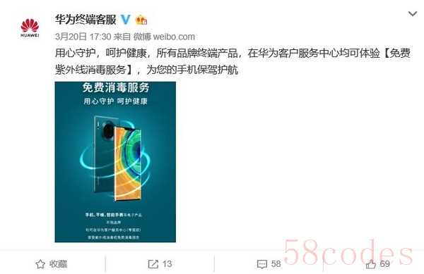 【手机中国新闻】华为终端客服日前在官微发布微博称:“用心守护,呵护健康,所有品牌终端产品,在华为客户服务中心均可体验免费紫外线消毒服务,为您的手机保驾护航。 ”据悉,本次免费消毒服务面向所有品牌,无论是手机、平板、智能手机等电子产品均可在华为客户服务中心(专营店)享受紫外线消毒柜免费消毒服务。