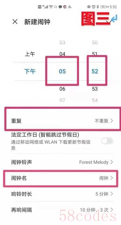 4、点【重复】设置闹钟在哪天响,点【闹钟名】设置闹钟的名称,例如:起床(如图四)