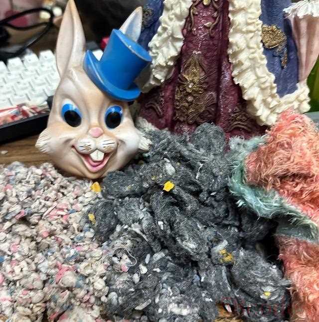 立刻把恐龙剪开,里面黑灰色的碎塑料像劣质泡面渣,一捏就碎。