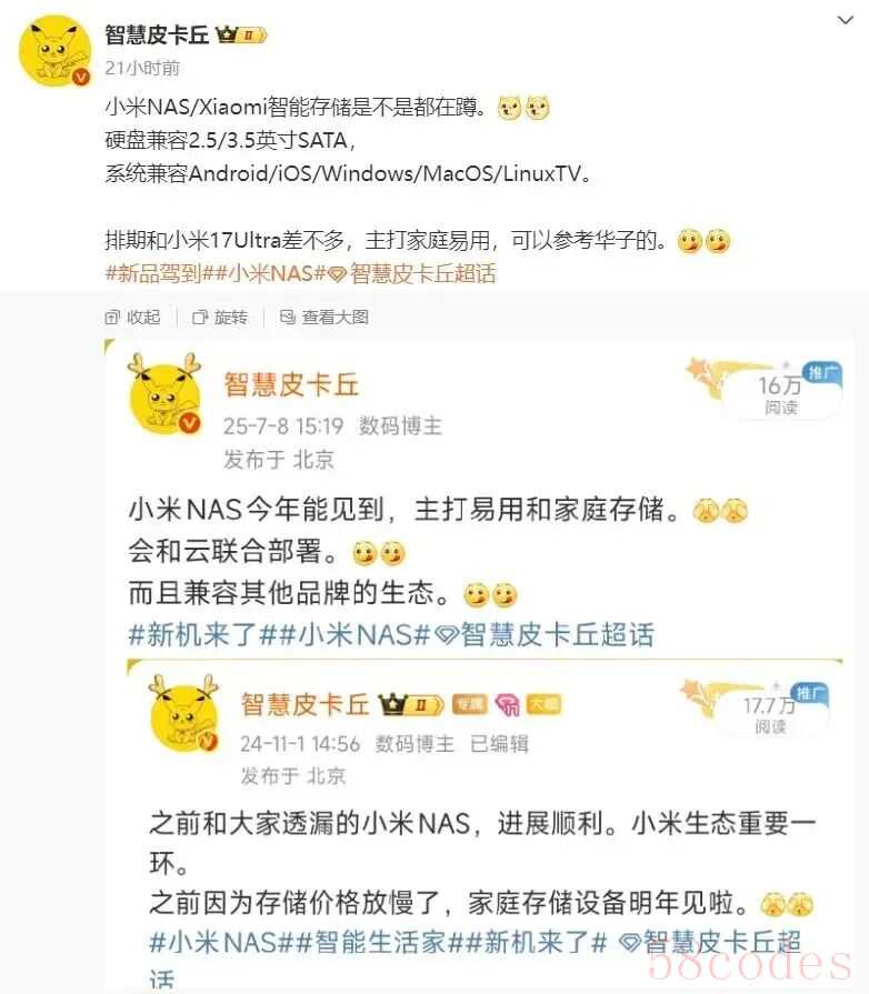 发布时间方面,有消息称其将于12月第4周发布,大家可以保持关注。除了旗舰影像新机,下个月小米还将带来首款 NAS 家庭存储产品。据博主@智慧皮卡丘 爆料,小米 NAS / Xiaomi 智能存储硬盘兼容 2.5/3.5 英寸 SATA,系统兼容 Android / iOS / Windows / MacOS / LinuxTV。排期和小米 17 Ultra 差不多,主打家庭易用。