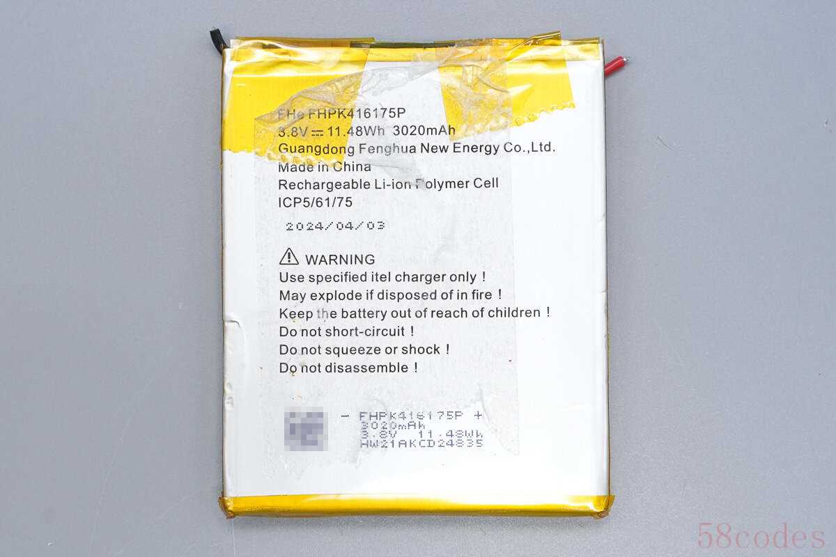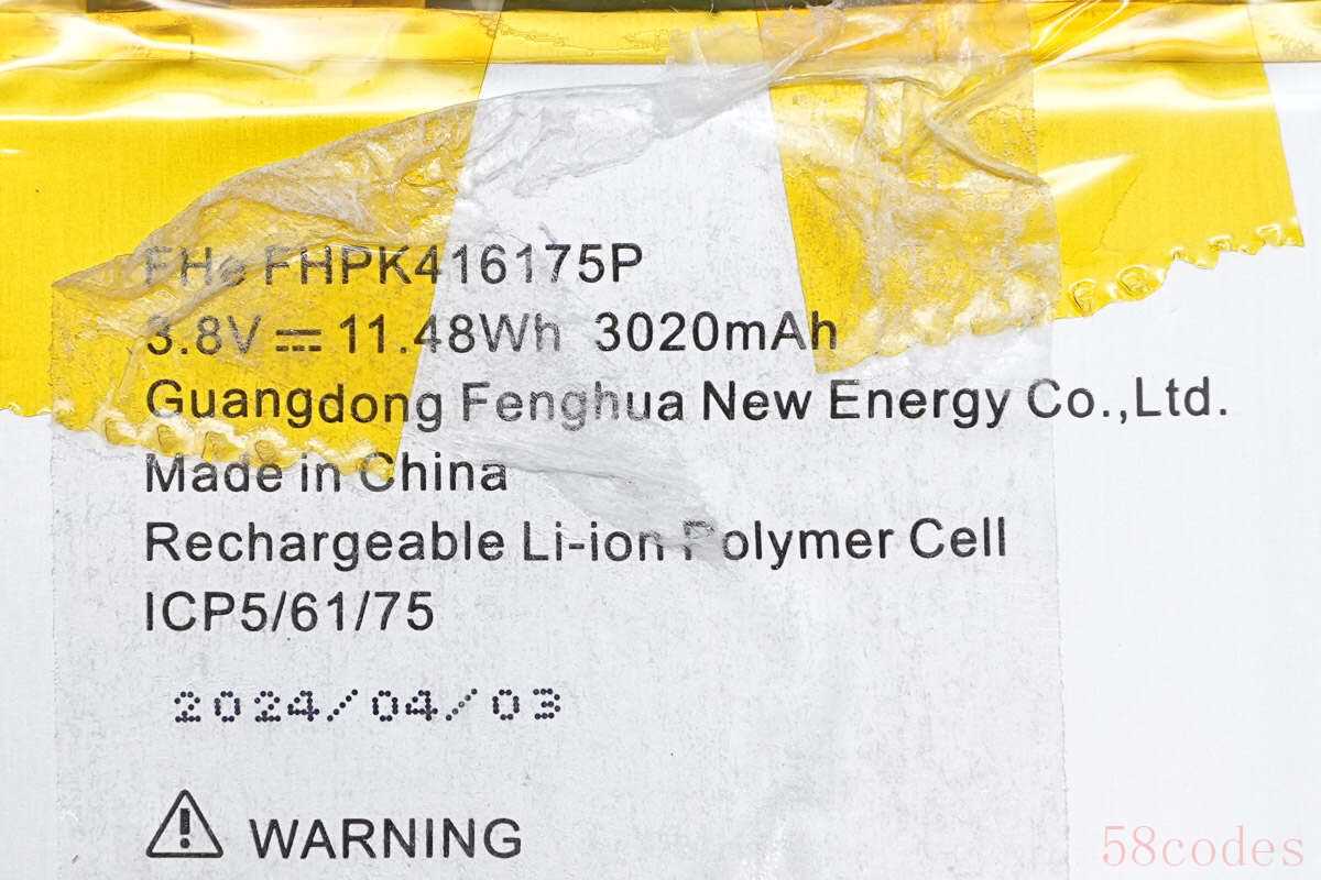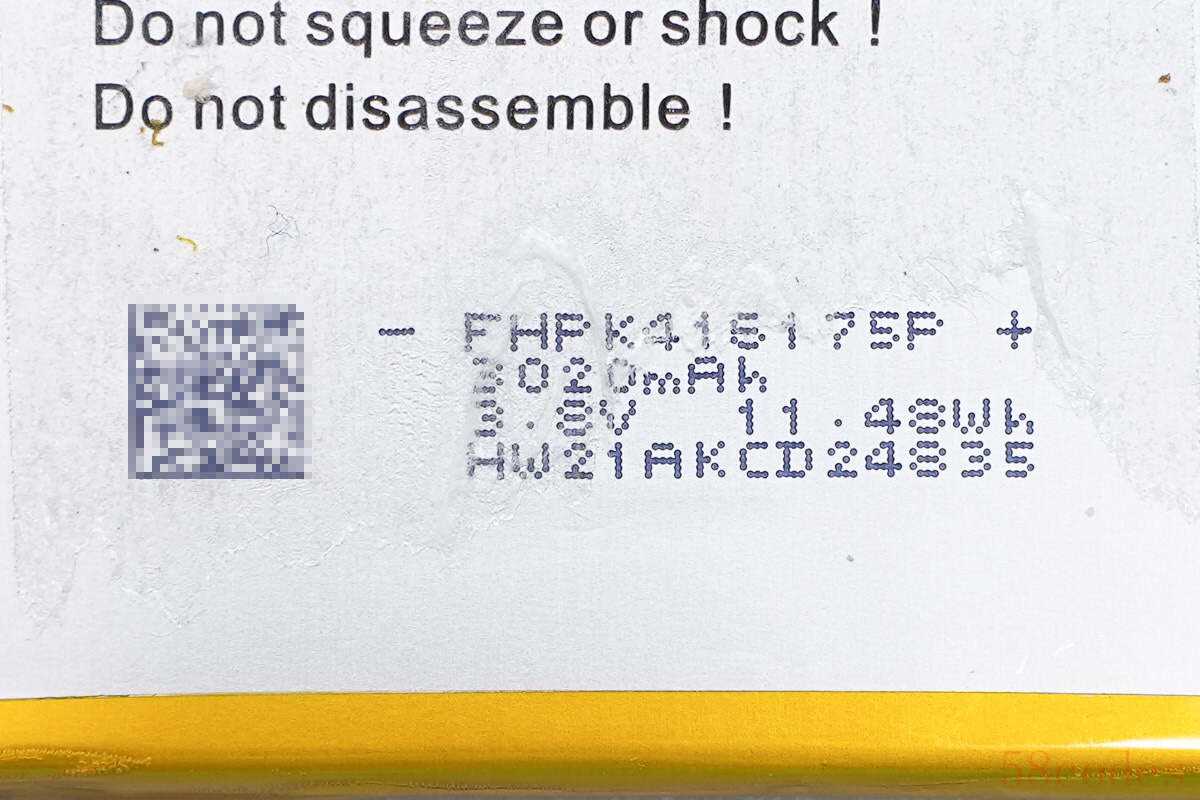 电芯型号为FHPK416175P,单块规格为3020mAh/3.8V/11.48Wh。