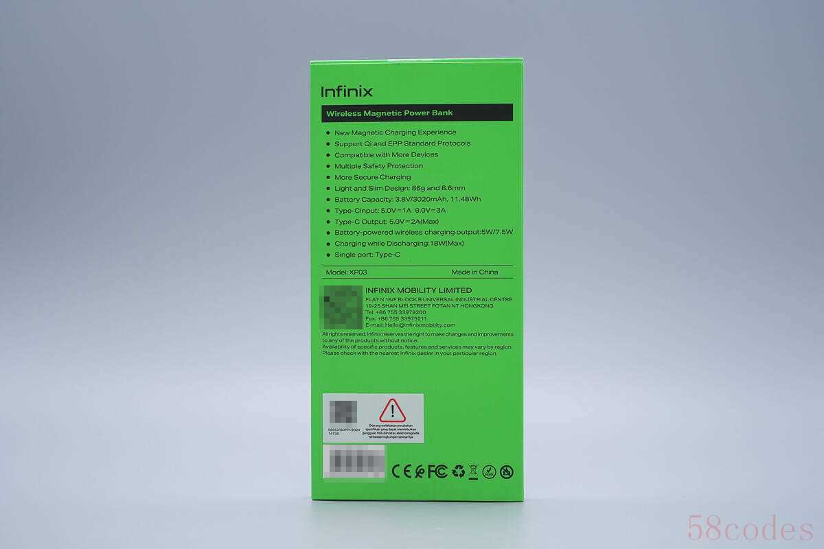 充电宝采用单独纸盒包装,白绿配色,正面印有infinix品牌、产品外观以及名称。