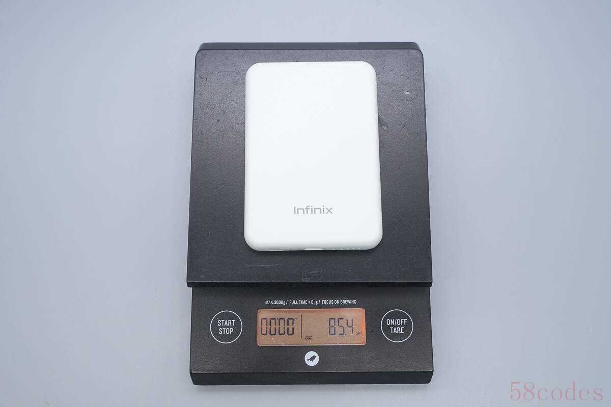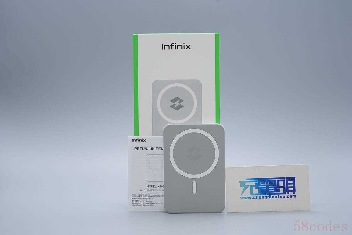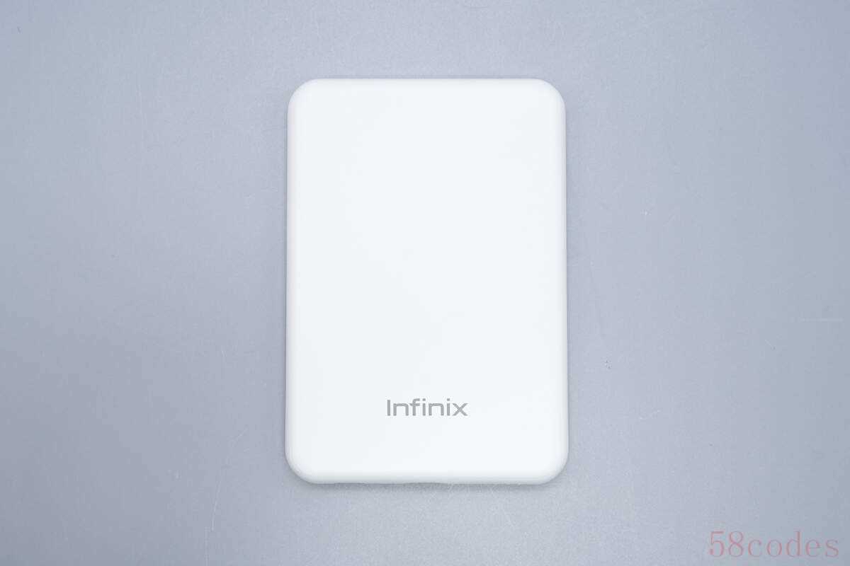 infinix这款磁吸无线充电宝采用PC阻燃材质塑料外壳,灰、白色配色,正面有经典的无线充区域提示设计。