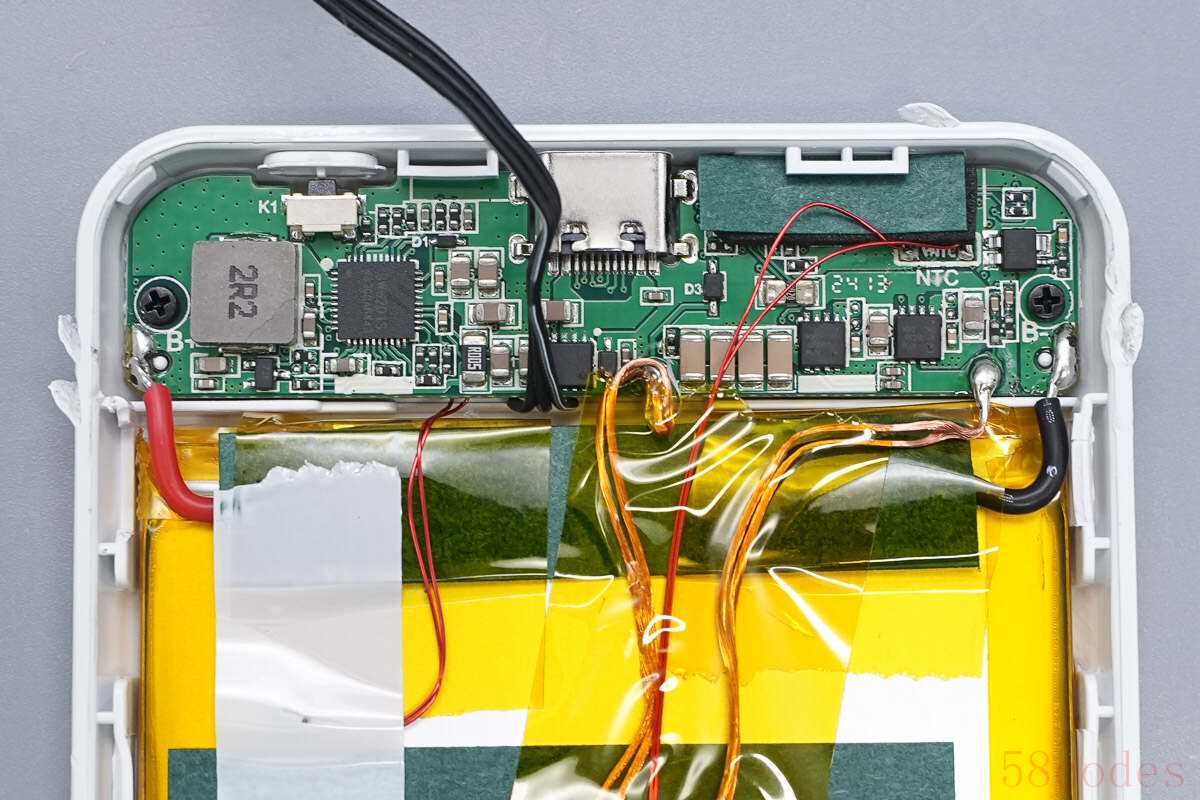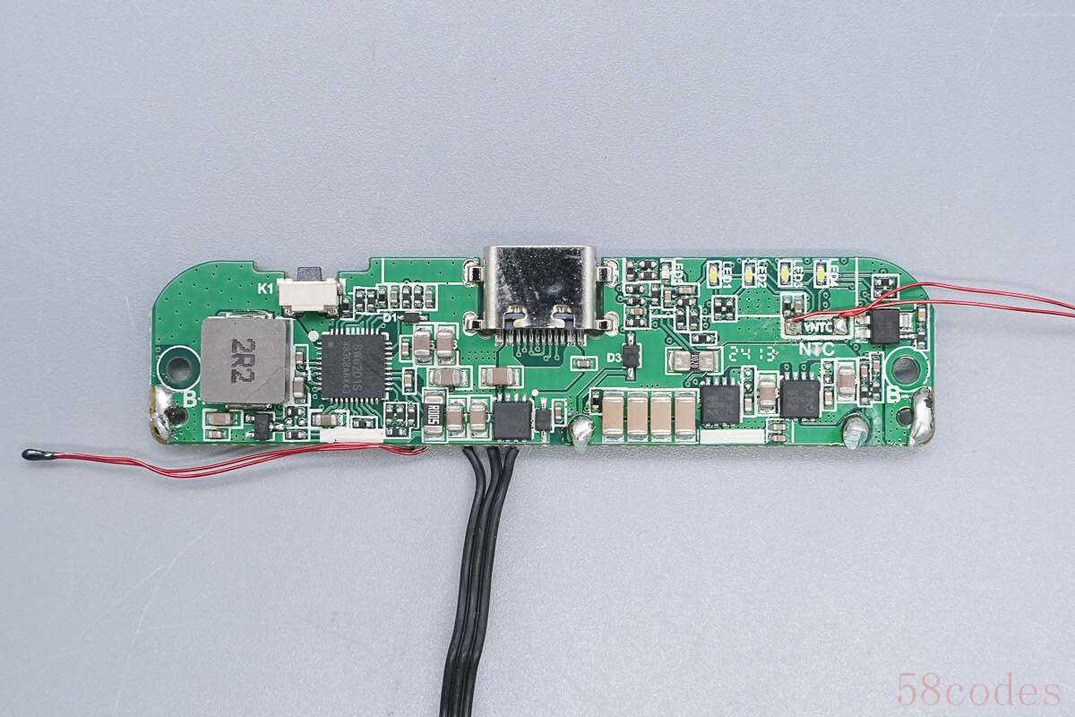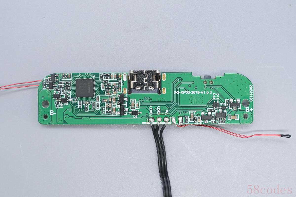 充电宝内部电芯通过导线锡焊与PCB板连接,前端包裹青稞绝缘纸和胶带,PCB板使用螺丝进行固定。