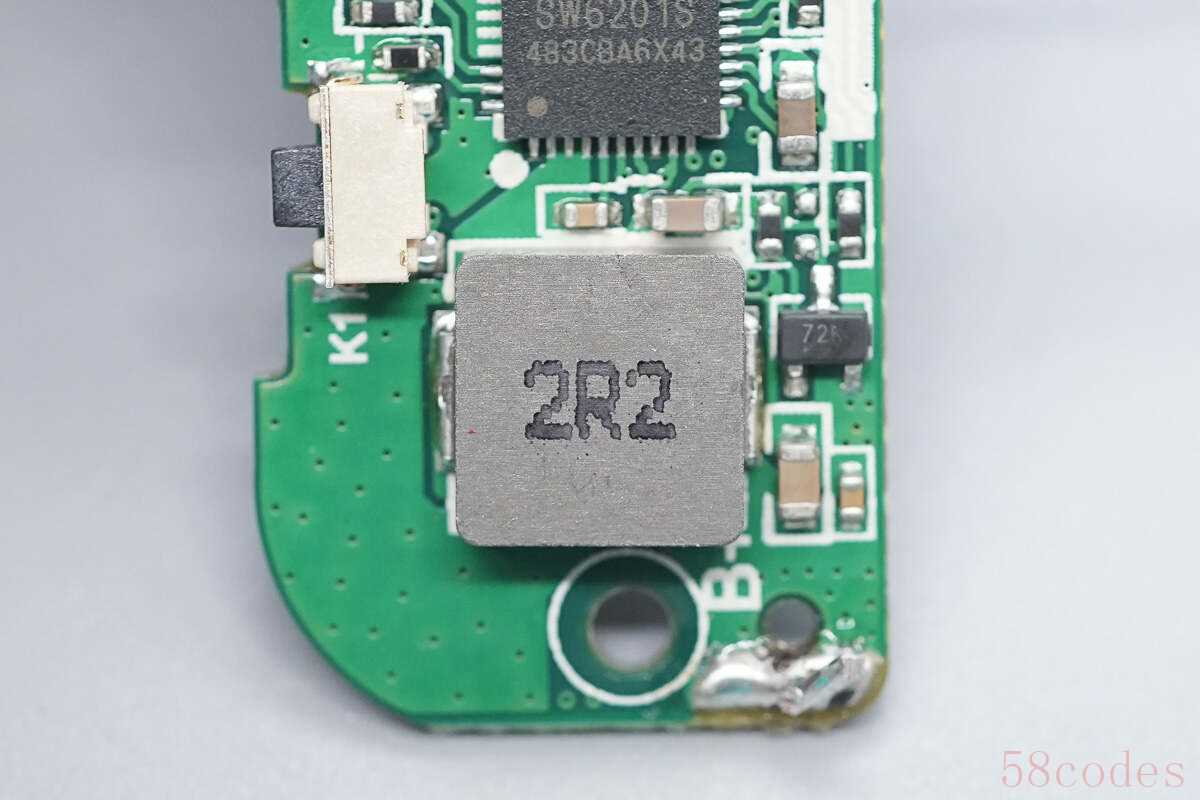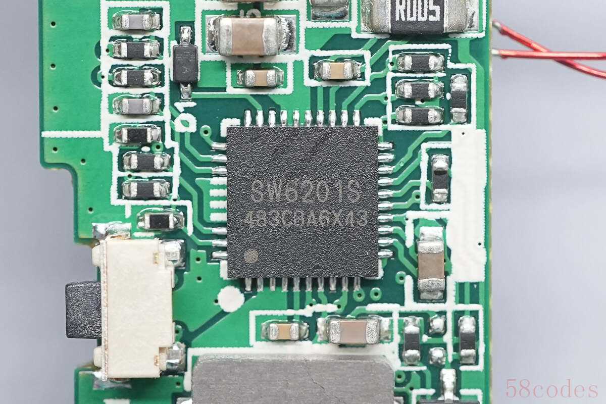 移动电源主控芯片来自智融科技,型号SW6201S,这是一款高集成度的多协议双向快充移动电源专用多合一芯片,支持A+A+B+C口任意口快充。其集成了5A高效率开关充电,22.5W高效同步升压输出,