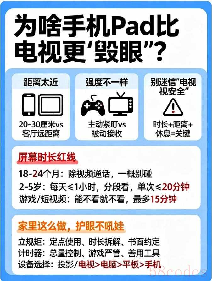 - 睡前 1 小时:啥屏幕都别碰!蓝光不直接致近视,但会让娃睡不着,别给自己找哄睡麻烦。