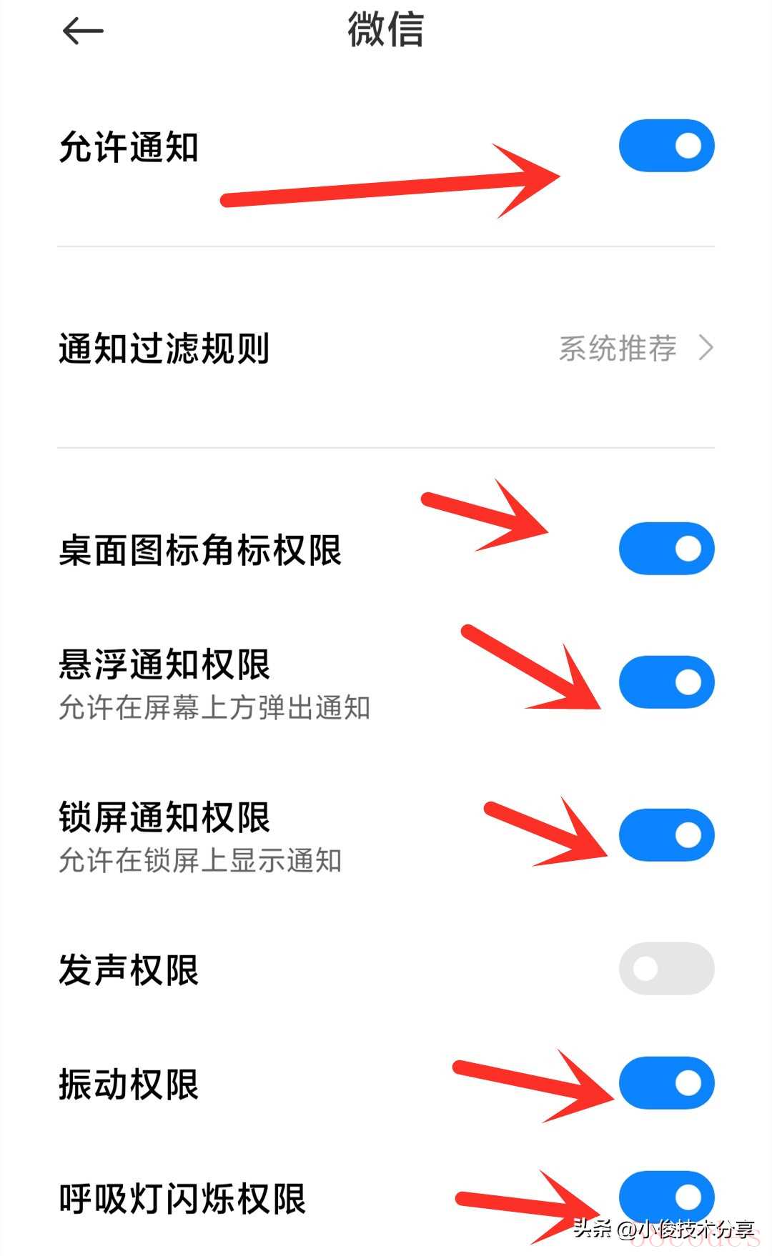 接着把微信里面的全部通知开关都打开,比如允许通知,悬浮通知权限,锁屏通知权限等等,这些权限开关都打开,开启这些通知开关之后,我们在使用微信的时候,就不会出现无法接收消息的情况了!