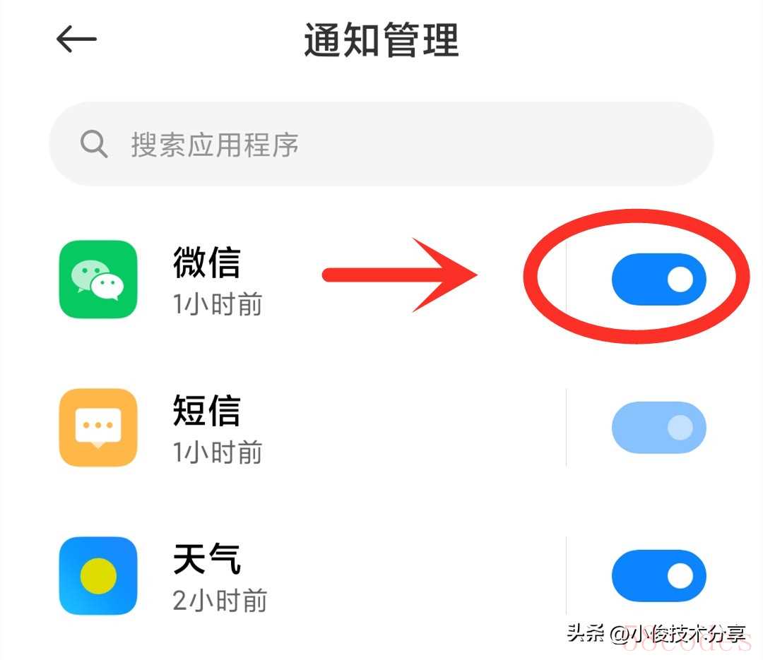 第三情况,我们需要在通知管理里面把微信通知权限开关打开,因为如果你在通知管理里面把微信通知关闭了,那么无论你怎么设置,都是收不到微信消息通知的,所以我们要在通知管理里面看看是不是把微信关掉了!