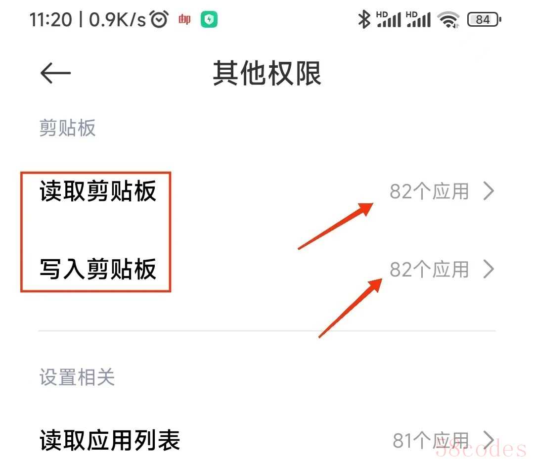 打开手机的设置,依次找到【应用设置-授权管理-权限管理-其它权限】,在这个页面的中间位置可以看到与剪贴板相关的2个权限,分别是【读取剪贴板】和【写入剪贴板】。