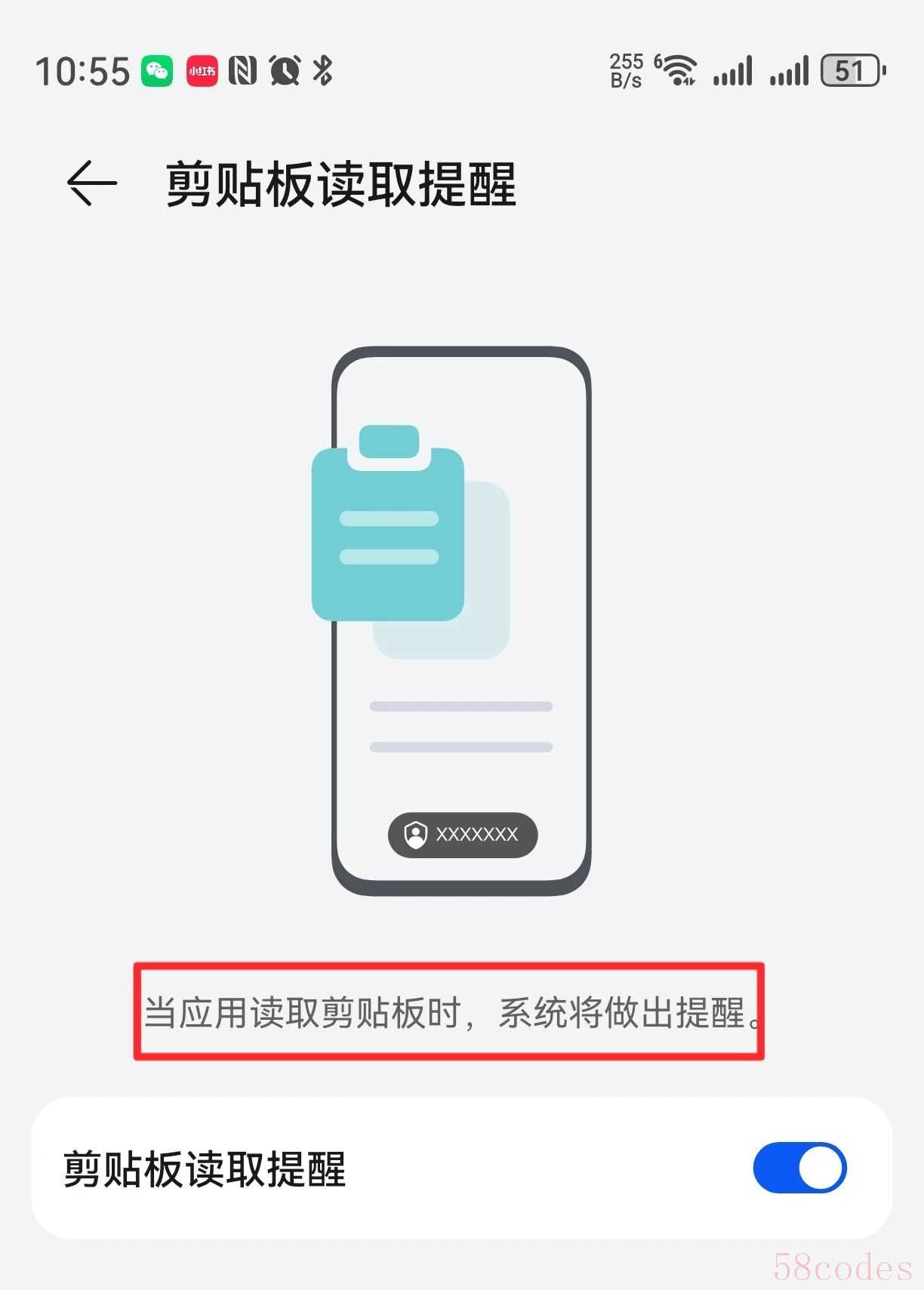 进入这个选项,然后打开“剪切板读取提醒”右侧的开关之后,当应用软件读取剪贴板时,就会出现相应的提醒。
