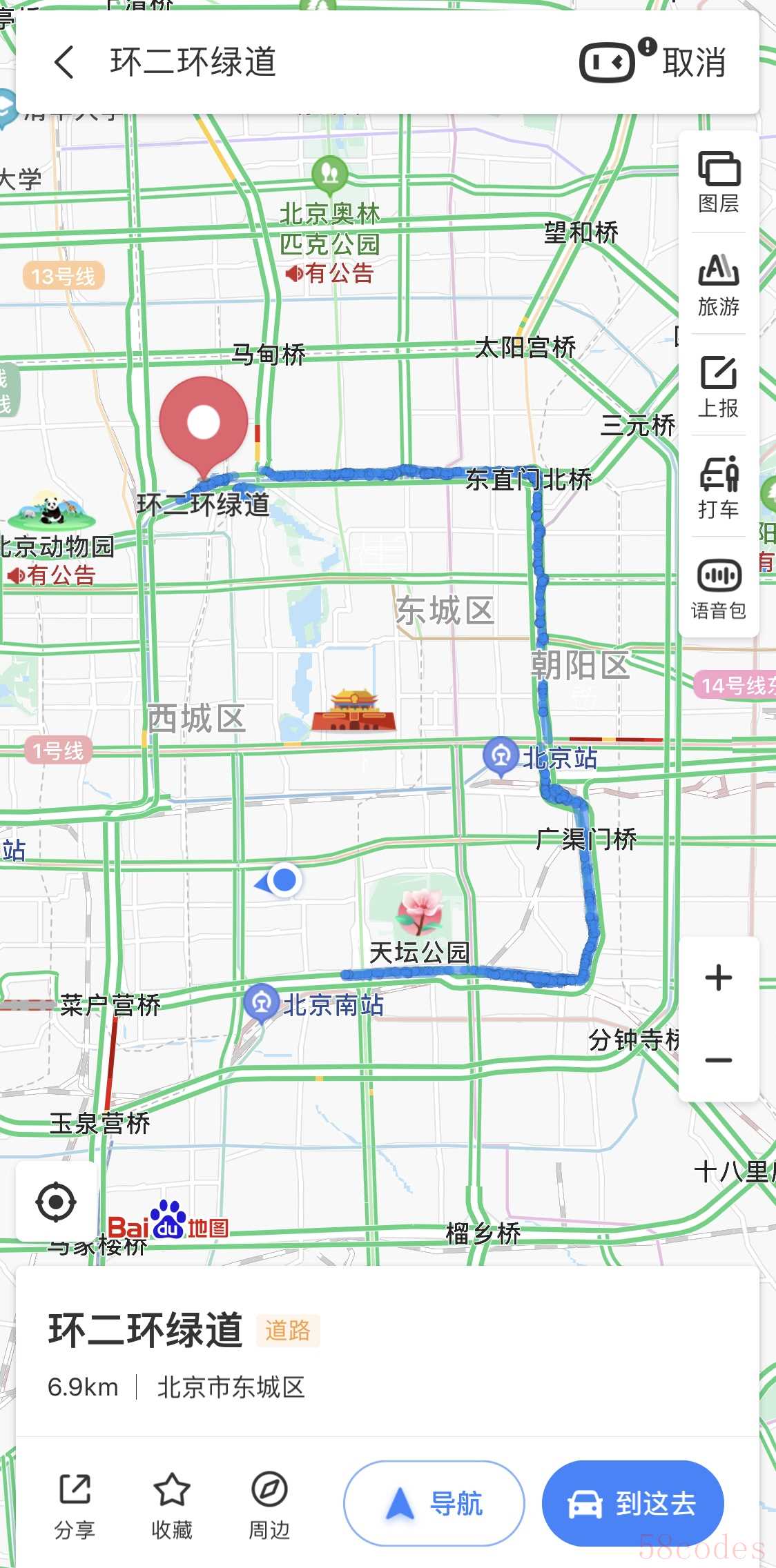 今天下午,记者打开手机百度APP搜索“环二环绿道”,一条起止点分别为北京先农坛体育场附近和德胜门西大街的蓝色路线就显示在地图中,串联起沿途的天坛公园、龙潭公园、地坛公园、北滨河公园等公园景区。