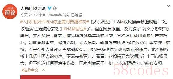 人民日报评论指出,H&M回应了,但在网友眼里,反而多了“玩文字游戏”的味道,并不买账。此前,该品牌跟风操弄新疆议题,宣称停止使用新疆生产的棉花,如此罔顾事实、傲慢无知,让人愤慨。新疆没有所谓“强迫劳动”,事实胜于雄辩,不是个别人造谣抹黑就能改变。H&M宁愿相信少数人散布的谎言,也不愿听听十几亿中国人的心声、不愿去新疆走走看看,这般操弄意欲何为?中国市场虽大,但不欢迎任何恶意中伤者;国家利益高于一切,“吃饭砸锅”注定痴心妄想。
