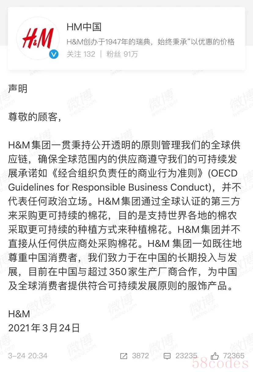 H&M集团在网站发布的这份声明引发关注