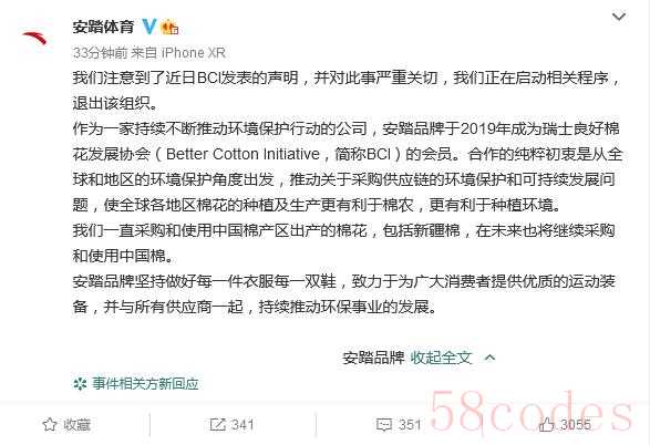 另外,事件发生后,安踏体育发布声明,退出BCI组织,并表示“一直采购和使用中国棉产区的棉花,包括新疆棉,在未来也将继续采购和使用中国棉”。