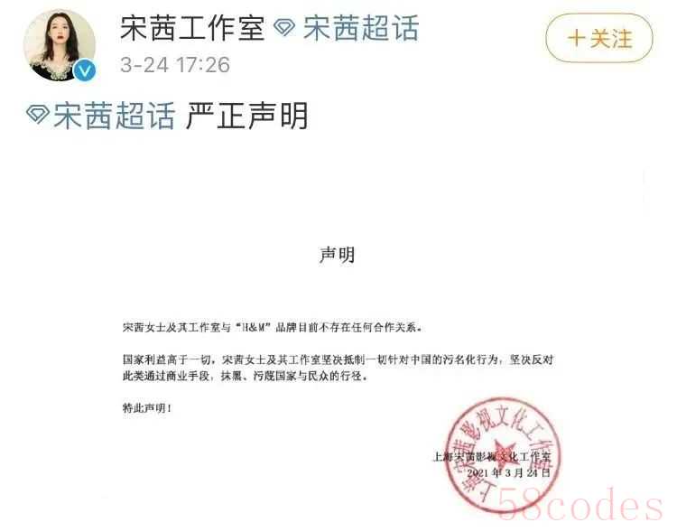 下午17时许,@宋茜工作室 发表“严正声明”称,宋茜女士及其工作室与“H&M”品牌目前不存在任何合作关系。