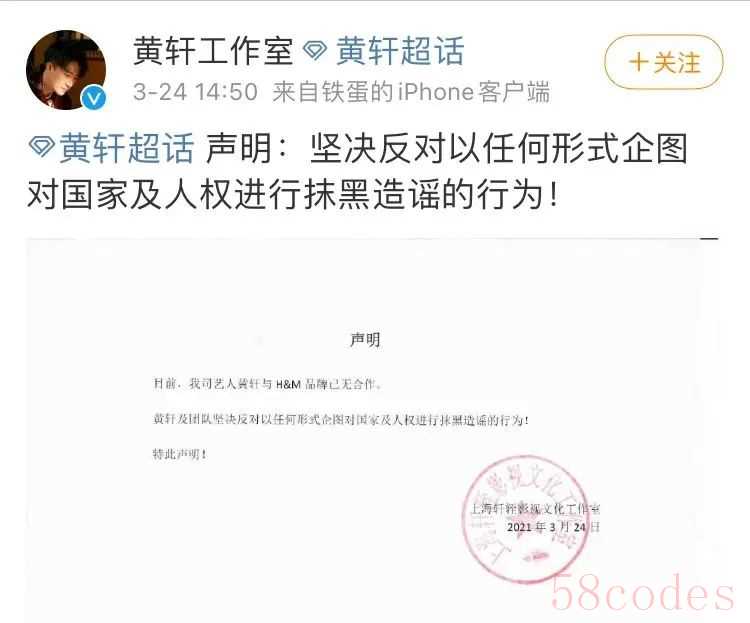 3月24日14时许,黄轩工作室发表声明称“目前,我司艺人黄轩与H&M品牌已无合作”。