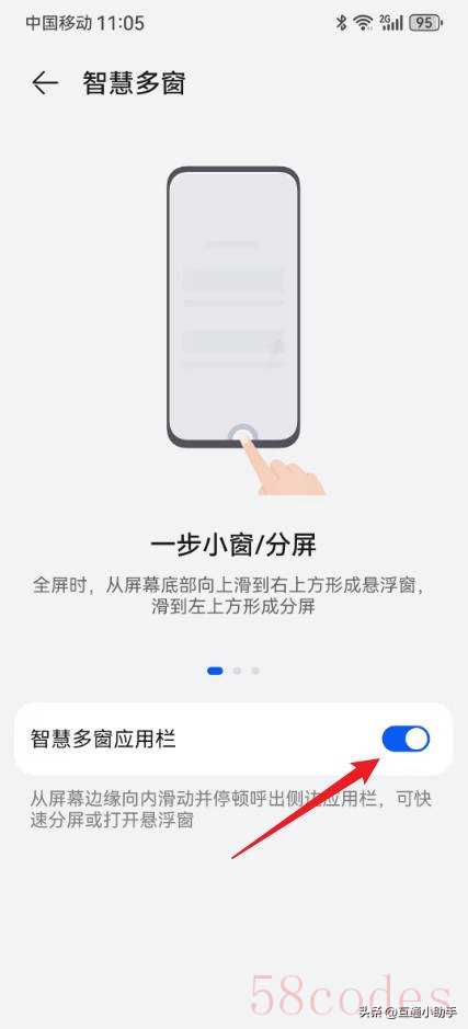 3、进入到智慧多窗页面,拖动“智慧多窗应用栏”右侧按钮开启。